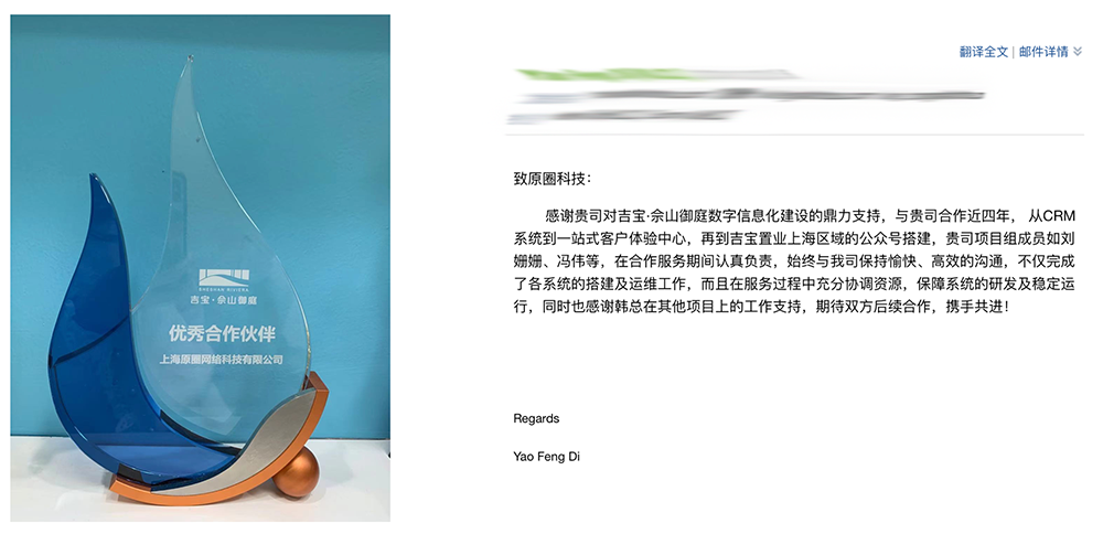 连续三年续约,且在当前合作基础上多次增购原圈其他功能模块,2020年底颁发优秀合作伙伴奖杯及感谢信对合作及服务予以肯定