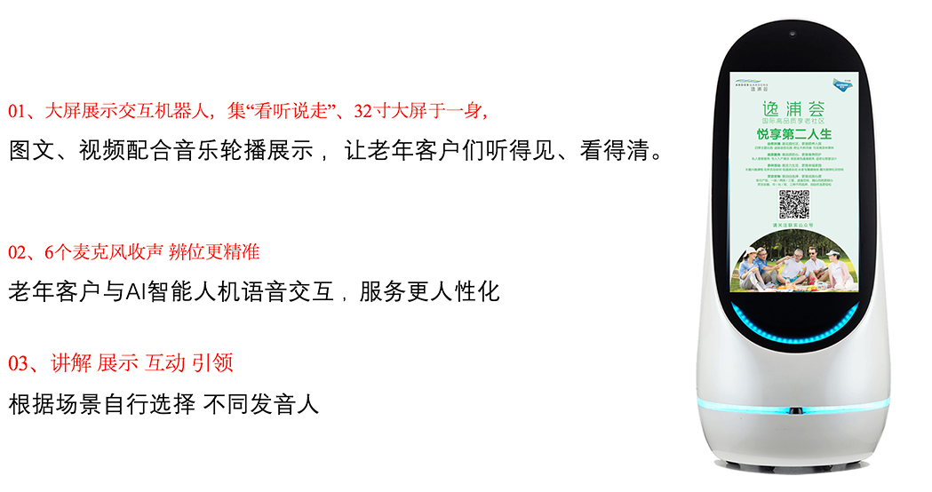 原圈科技抓住联实Lendlease服务老年客户群体存在听力、视力不好等普遍现象,专门为该养老项目研发打造了一款集集32寸大屏、自主建图、自动回充、自主避障、语音交互、人脸识别、6路麦克风于一身的超级AI智能机器人服务于老年客户群体。当老年人来访时,凭借机器人超大音量与来访者互动、带领客户并讲解项目情况。