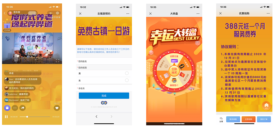 通过微信小程序的私域直播,结合项目特性及客群特征,联实邀请了上海本地,深受叔叔阿姨们喜爱的反串视频博主,搭配专业销售经理担任直播主持人,以城市养老话题为主线,结合项目介绍,加抽奖送福利环节,以及多种多样实物奖品、免费朱家角古镇一日游、优惠券秒杀等福利,促进案场到访及最终成交转化。